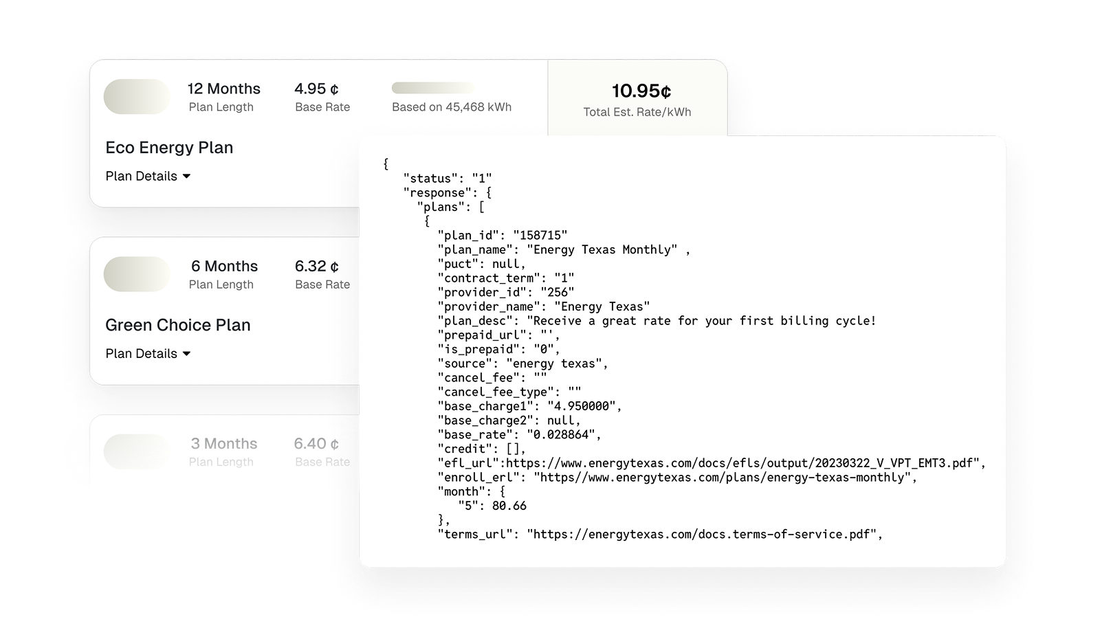 The API supports both ERCOT and non-ERCOT markets and delivers a consistent view of competitive pricing data for monitoring market movement and plan positioning.